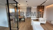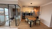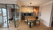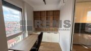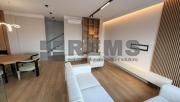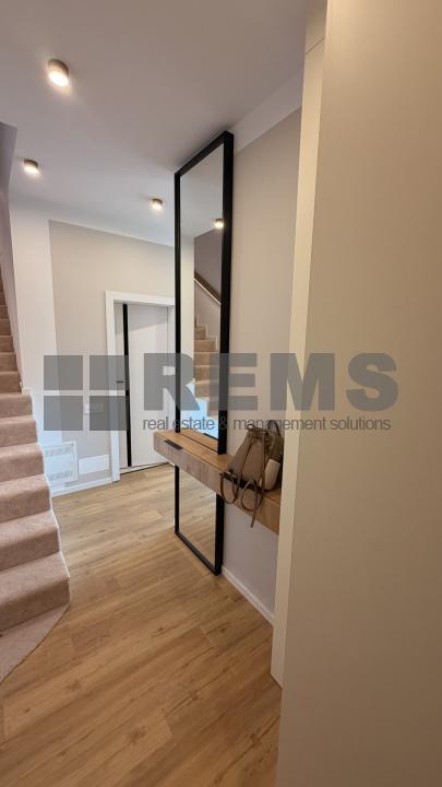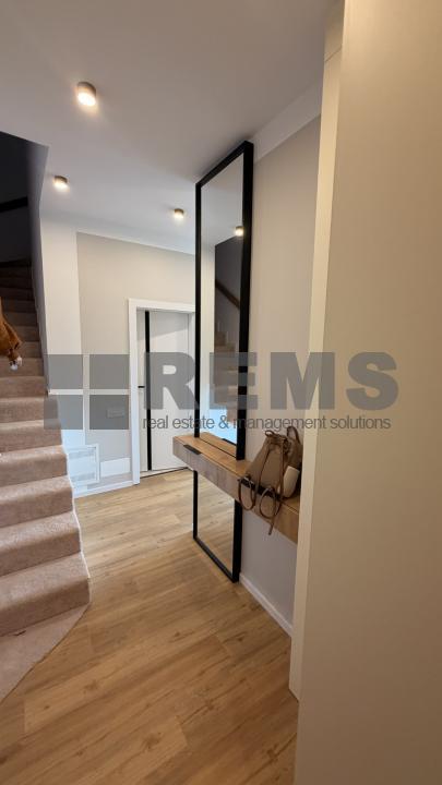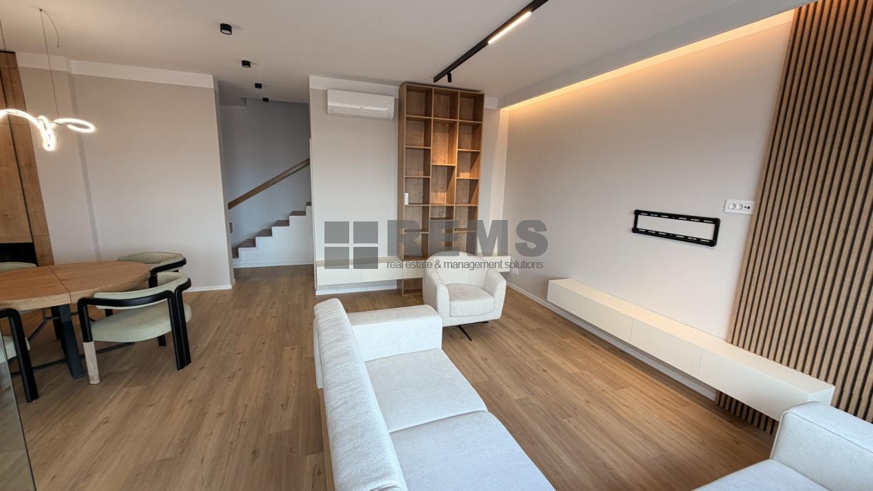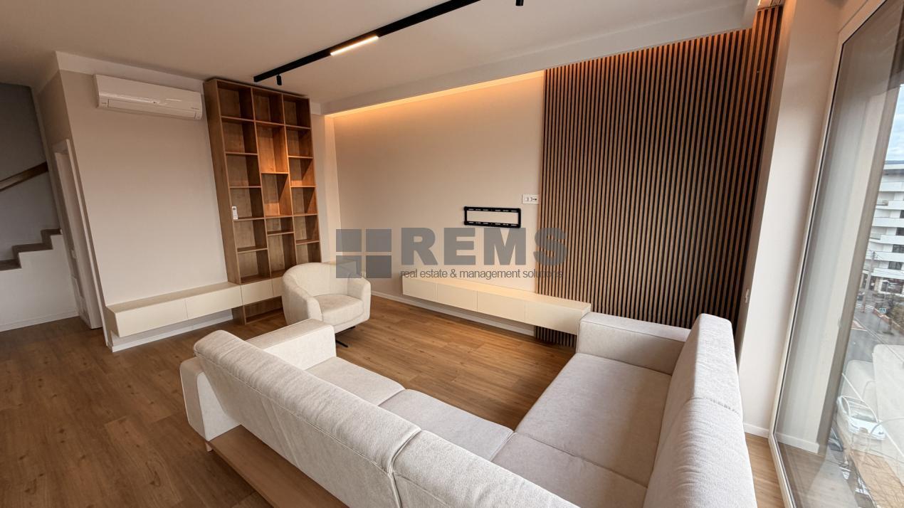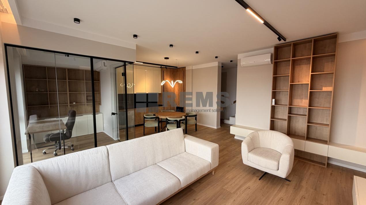 Locuinta este organizata pe doua niveluri, cu o compartimentare practica si bine echilibrata. Primul nivel include un hol de acces generos, echipat cu dressing, baie si scara interioara. Zona de living este deschisa si primitoare, amenajata cu mobilier confortabil, iar bucataria, complet utilata, este integrata armonios in spatiu. Separat, exista un birou delimitat prin pereti de sticla, potrivit pentru activitati profesionale. Intregul mobilier este realizat la comanda, adaptat perfect configuratiei apartamentului.